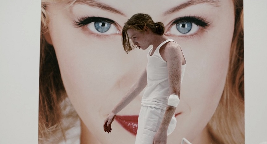 吐血を際立たせるために白を基調とした画面構成をとるなど