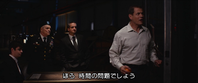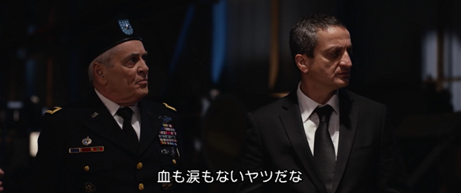 ↑案の定、米軍のお偉方相手に殺人機械兵団のプレゼンをしているマイケル・パレ。任務というのは嘘で、バトルドローンでレイカーたちを倒す様子を実況中継して威力を見せ、売り込みたいだけだった。