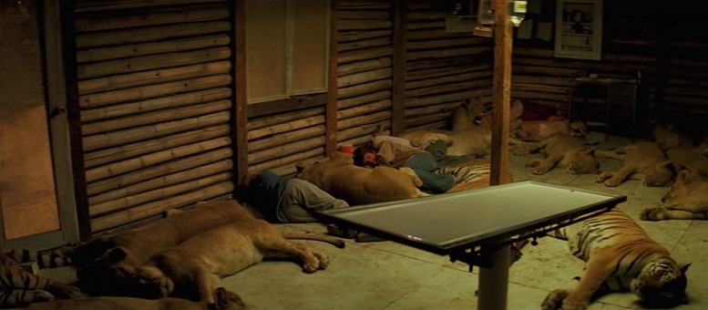 まあ確かにネコ科ですから、しぐさはでかいネコみたいでカワイイと言えなくもないですよ。しかしそれにしても多すぎやしませんかね。撮影に225頭も使ったという触れ込みでしたが家の中にそんなにいたらもう尋常じゃない猛獣密度。足の踏み場もないほどです。そんなのに代わる代わる抱き着かれ甘噛みされ…そのうち1頭ぐらいうっかり野生の本能を出しちゃったりしないの?