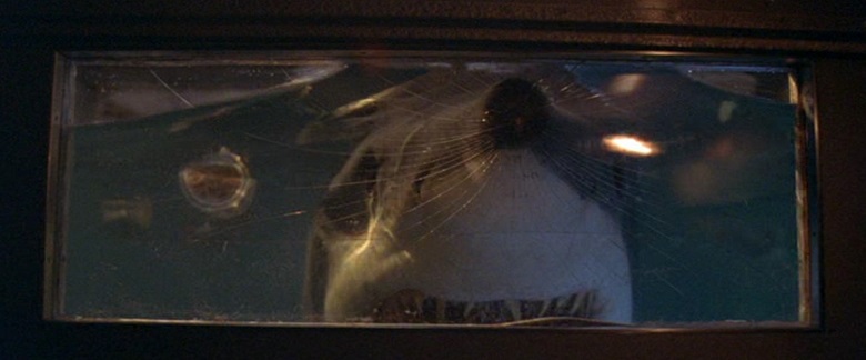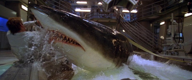 しかし改めて鑑賞してみると、各登場人物の死に様のインパクトが実に大きいことに気づかされます。有名になり過ぎたサミュエル・L・ジャクソンの例のシーンにばかり気を取られがちですが、映像的には右腕を喰いちぎられたうえにタンカごとサメに投げ飛ばされて海中ガラスをブチ割る道具にされたステラン・スカルスガルドの死に様が猛烈に悲惨だし、エレベーターシャフト内で徐々に上がる水位と共に追いつめられてやられる海洋生物学者の喰われ方も妙に心に残ります。