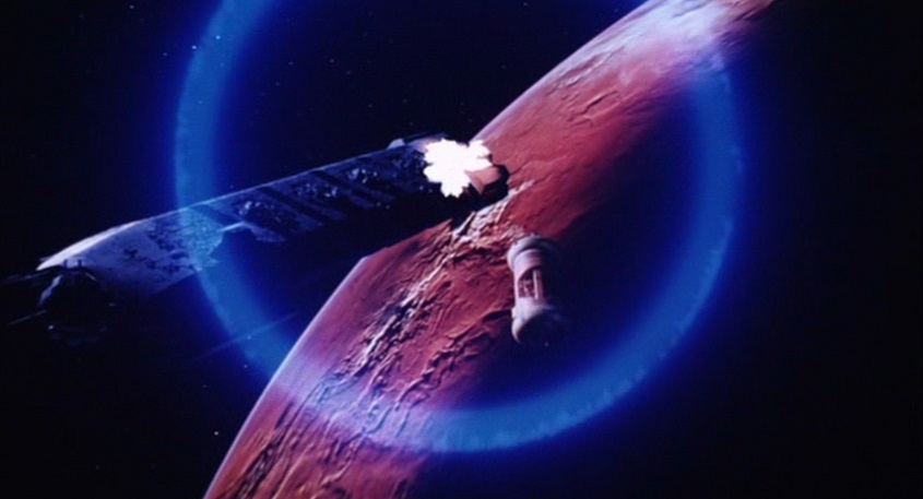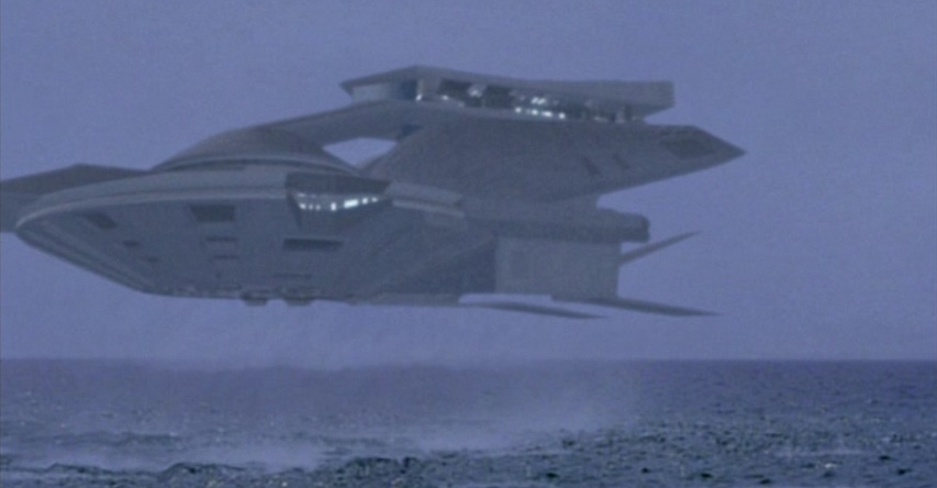 爆発が起き、砂時計みたいな変なもんが飛んでいき地球の海に落下。