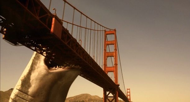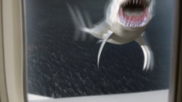 ↑飛行中のジャンボジェット機に喰らいつくメガシャーク。数少ない貴重な出演シーンです。CGがなぜかブレブレで非常に観にくいのが難点。今さらCGの質をごまかそうとしなくてもいいのに。ちなみにタコの方はジェット戦闘機を撃墜してくれます。
