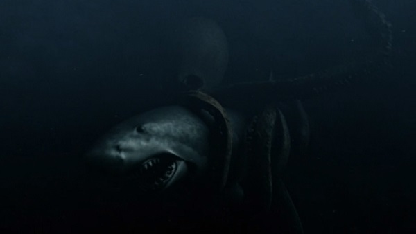 ↑メガ・シャークとジャイアント・オクトパスの戦いは終盤にほんの少しあるだけ…
