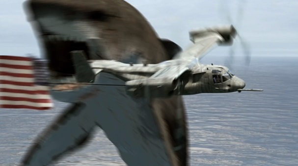 ↑いつものようにオスプレイみたいな航空機にジャンプして噛みつこうとするメガシャーク。