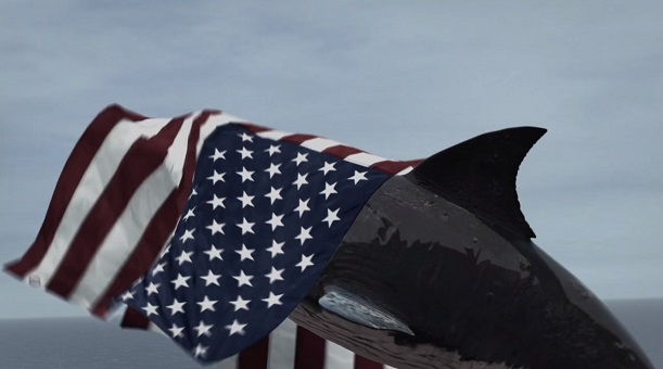 ↑でかい星条旗で目隠しされてしまって戸惑うメガシャーク。かわいい。