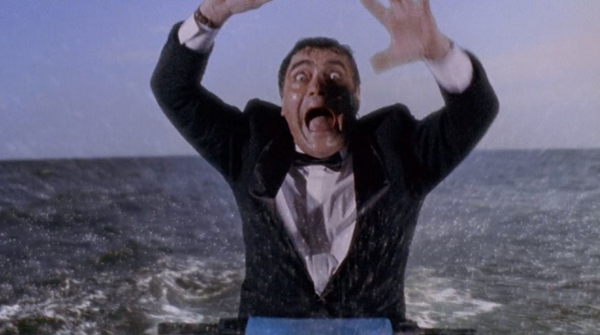 メガロドンの襲撃を受け、パニックに陥るクルーザーを尻目に自分だけ水上バイクで逃げ出そうという、