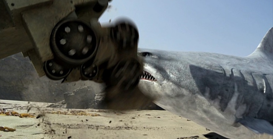 「戦車や戦闘機と激しく交戦(たわむれ)る超巨大メガロドン(スーパーシャーク)の姿」
