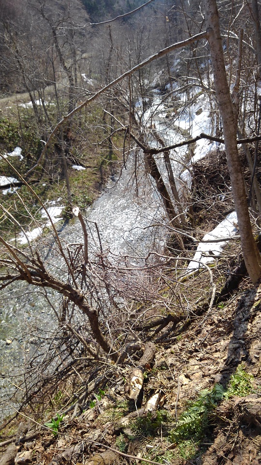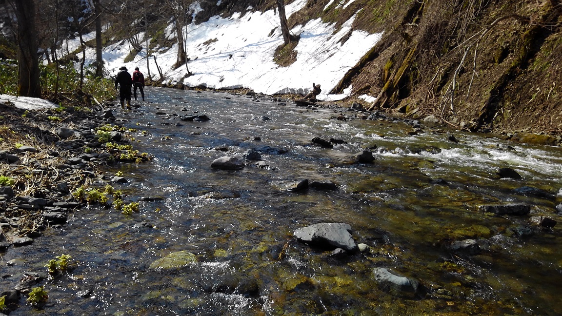 ↑ここは4月も末だというのにまだまだ雪が残る山中の清流付近。