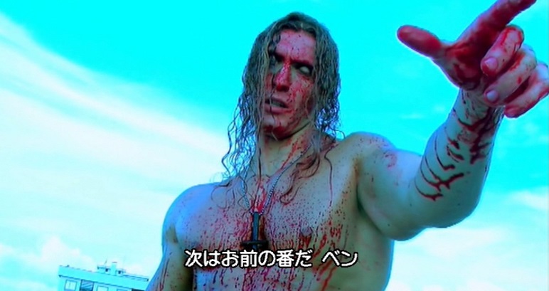 ↑本作のために肉体を鍛え上げ、製作と監督と主演と脚本と音楽他を1人で全部こなした凄い漢エマニュエル・デ・サンディ。悪魔の力を借りているせいか作中ほぼ白目を剥いています。わざわざ白目になる必要があったのかかなり疑問ですが、本作に充満する怪しいエネルギーの大半はこの男から発せられており超スゲエと言わざるを得ない。ほぼ常時返り血に染まっていてキタナイ気もするが本作は血が映っていないカット自体がほとんどない勢いだから仕方ない。