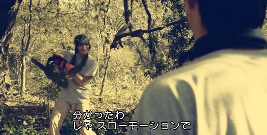 チェーンソーで邪魔な木を伐採して歩道を作るというボランティア活動にいそしむアホ女。