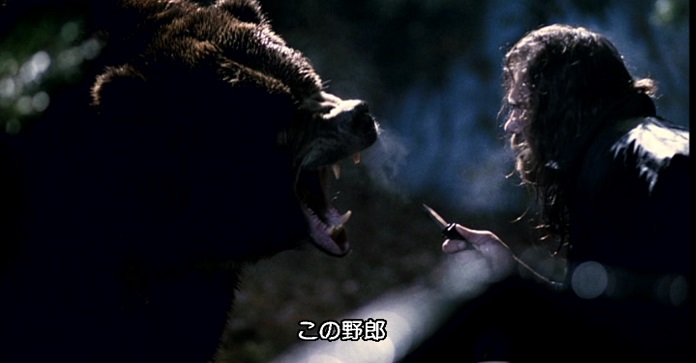 ↑襲ってくるのは熊だけでも充分なんですが、地味に殺人鬼も投入されております。しかし、殺人鬼は不良少年たちにはほとんど絡まず、真っ先に熊と対決。いくら凶悪犯でもこんなチンケなナイフでは熊に勝てるはずもなく即死。お前は何のために出てきたんだ?? と思ってしまいますが、しっかりオチに活用されており意外と無駄がない。