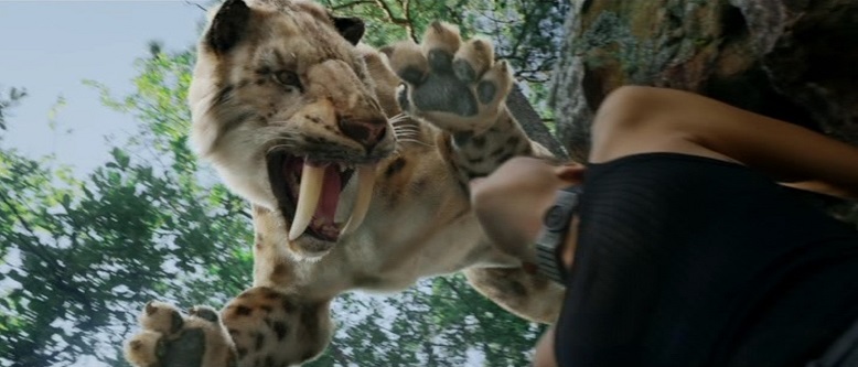 ↑そして急に襲ってくるサーベルタイガー。恐竜はどうした??と言いたいところですが、はっきり言って本作において恐竜など限りなくどうでも良い存在だと言い切れます。死刑囚を襲ってさえくれれば別に何が出てきても構わない。VR空間なので何でもアリなんです。というかどうしてあの巨大グモは暴れさせなかったのか。もったいない。そこら辺がテキトーすぎるからこそのクソ映画です。このサベタイもかっこよく飛んできたはいいがそのまま勝手に崖下に落っこちていきました。何やってんの?