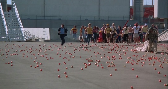 しかるに、本作ではこんな大勢がトマトから逃げたりトマトを踏み潰してくれるなんて、