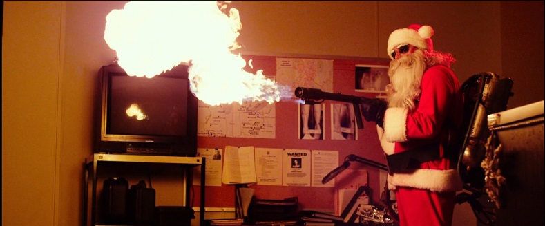 ↑殺人サンタのリーサルウェポンである火炎放射器と対峙して