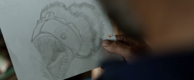 ↑観客に姿を見せる前に、目撃者による似顔絵でこちらの期待感を煽って来る手法。…かと思いきや、想像以上にコイツが画面に映らない。海からやって来たらしく背ビレがチラリ、鋭いツメがチラリと見えそうで見えないもどかしさを追求。そして兄弟が地下室に籠城している時間がやけに長い。いや閉塞感の演出的にも出来が良いので退屈はしませんしスリルの煽り方も上手いとは思いますが、まだ怪物出ないの?感は強い。