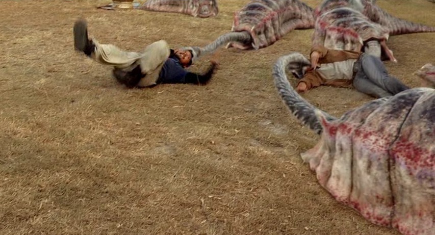 そうは言ってもモンゴリアン・デス・ワームはある意味グラボイズよりもビッグネームと言いますか、UMAとしては相当有名な存在です。なので毒液を飛ばしながら飛びかかって来るとか、電撃で攻撃してくるとかそういうネタを期待していたのですがその辺は特になし。いや全く何もないわけでもないけど、演出としては何もなし。ただ人間を丸呑みするだけ。喰いちぎってもくれないので結構地味。銃で撃たれりゃあっさり死にますしね。ゲームのザコモンスターの如き存在。