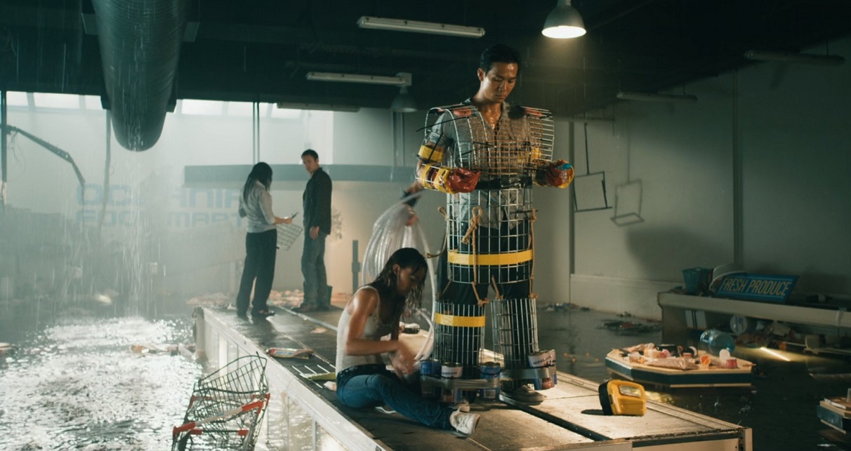 スーパーマーケットの店内だけでは画面の変化が乏しく、間が持たないと思ったのか、地下駐車場でも同じように半分水没した中での別グループによるサメパニックが並行して描かれます。