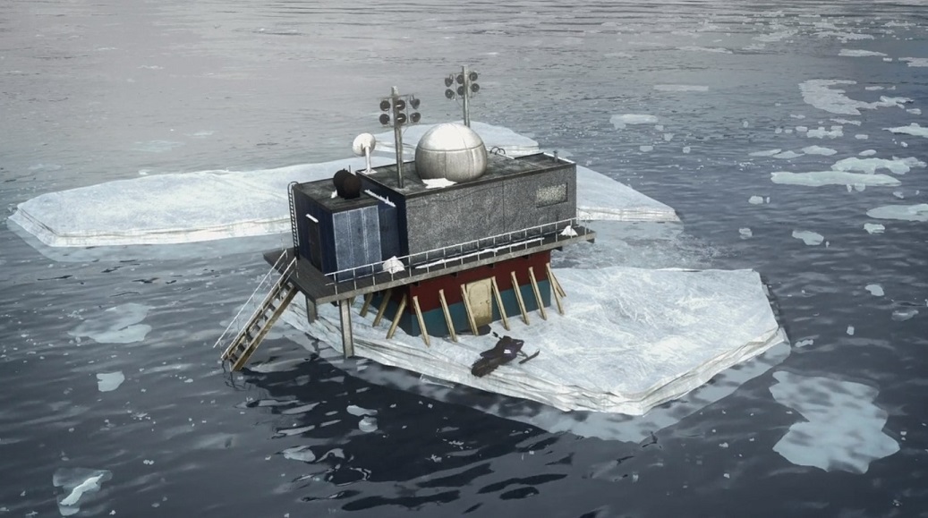 ↑アイスシャークの背ビレで氷が切り離され、漂流する基地オアシス。