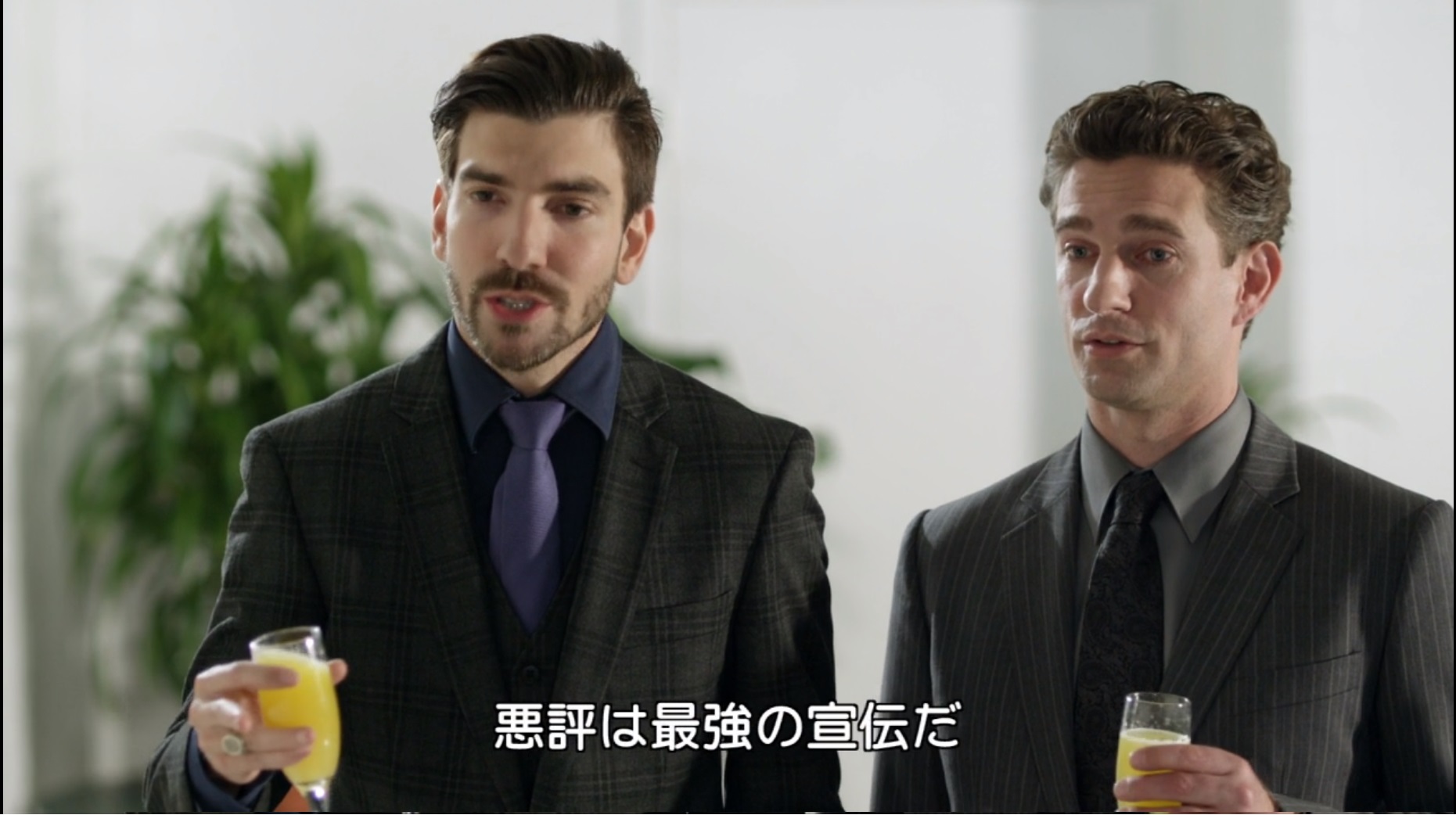 世間やTVショッピング会社の思わぬ反応に顔をしかめる2人組。