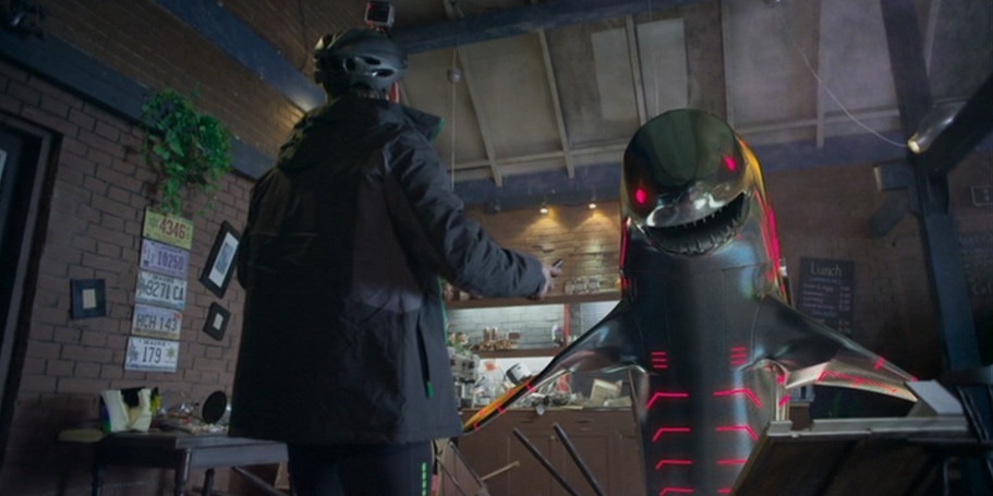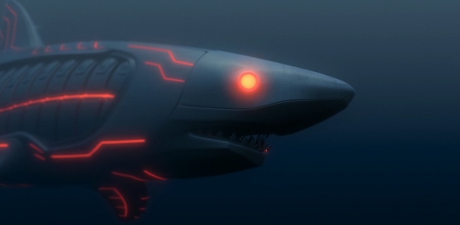 特に何の説明もありませんが、宇宙からの飛来物を喰ったサメがロボ化。